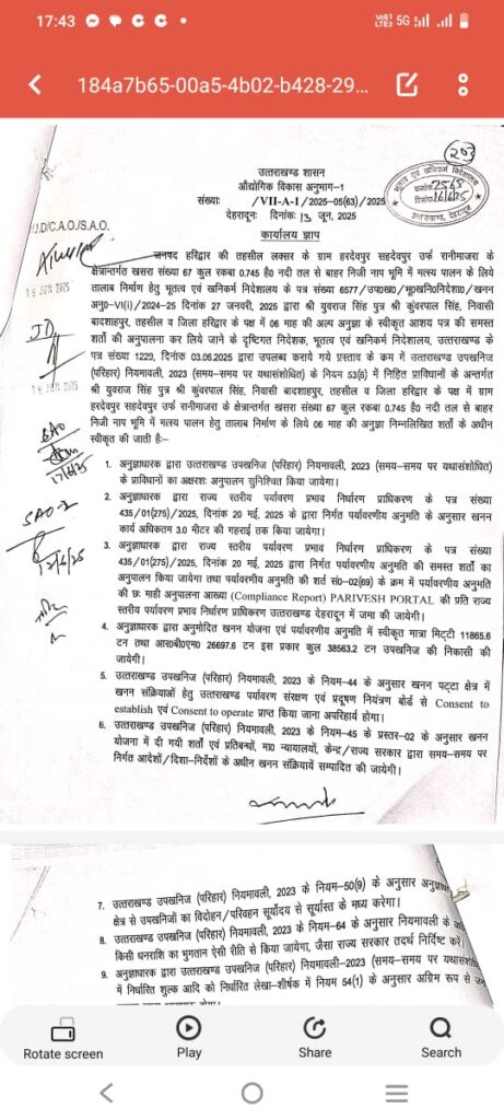 मातृ सदन के संज्ञान में एक कथित अनुमति पत्र आया है, जो दिनांक 13 जून 2025 को शासन से जारी किया गया है। यह अनुमति खसरा संख्या 67, रकबा 0.745 हेक्टेयर, ग्राम रानी माजरा के लिए मत्स्य पालन हेतु तालाब निर्माण के नाम पर 6 माह की अवधि के लिए दी गई थी। मातृ सदन का स्पष्ट मत है कि यह अनुमति पत्र जनमानस के साथ किया गया एक बहुत बड़ा धोखा (Fraud) है, और इस प्रकार के घोटालों की पटकथा स्वयं मुख्यमंत्री श्री पुष्कर सिंह धामी द्वारा रची जा रही है। हरिद्वार को धामी जी अपनी कुर्सी बचाने के लिए एक उपनिवेश में परिवर्तित कर चुके हैं और यह शासन/प्रशासन के लिए एक शर्म का विषय होना चाहिए कि हाई कोर्ट के इतने स्पष्ट आदेश को, जिसको बाद में उच्चतम न्यायालय ने भी माना है, उसकी भी अवहेलना करना इनके लिए एक सामान्य बात है।