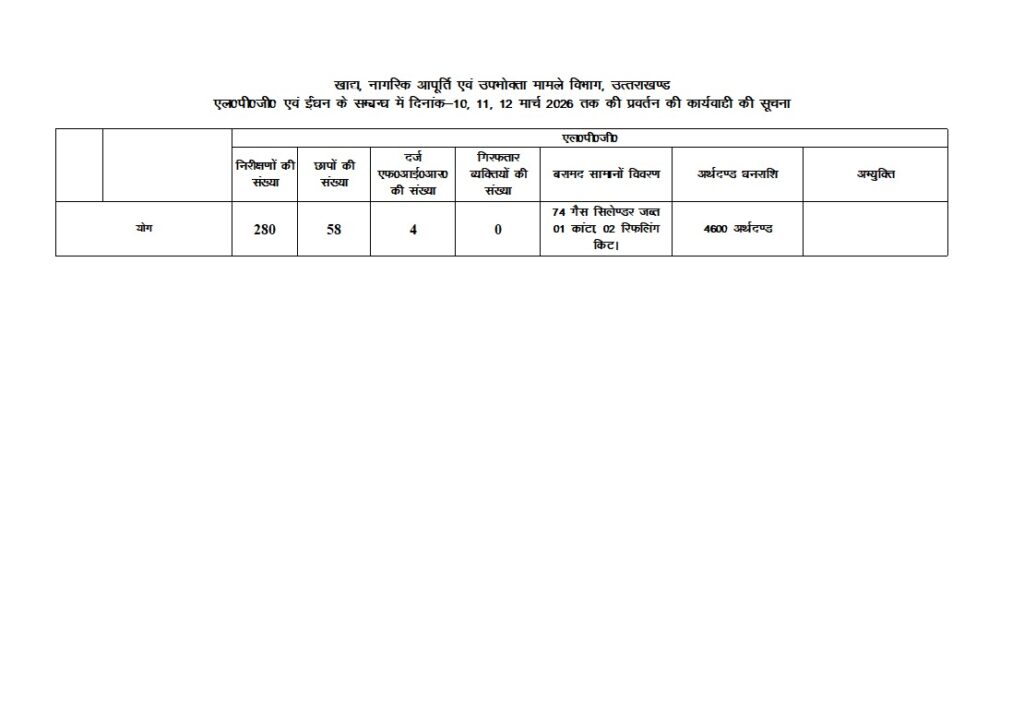 देहरादून। राज्य में एलपीजी एवं ईंधन की उपलब्धता तथा वितरण व्यवस्था को सुचारू बनाए रखने के उद्देश्य से खाद्य, नागरिक आपूर्ति एवं उपभोक्ता मामले विभाग द्वारा प्रदेशभर में व्यापक जांच अभियान चलाया जा रहा है। इसी क्रम में दिनांक 10, 11 एवं 12 मार्च 2026 तक विभागीय अधिकारियों द्वारा विभिन्न जनपदों में निरीक्षण एवं प्रवर्तन की कार्रवाई की गई।
