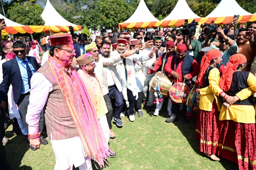 मुख्यमंत्री आवास का प्रांगण सोमवार को होली के रंगों में सराबोर नजर आया। इस दौरान प्रदेश की सांस्कृतिक समृद्धि और एकता के भी दर्शन हुए। पूर्वाह्न से ही प्रदेश भर के लोक कलाकारों, संस्कृति कर्मियों की टोलियां होली गायन करते हुए, सीएम आवास पहुंचती रही। एक तरफ गढ़वाल-कुमाऊं से लेकर जौनसार तक का होली गायन था, नृत्य था। इस दौरान होली के गीत गूंजे। पारंपरिक गायन हुआ। ढोल, मंजीरे बजे। पारंपरिक वाद्य यंत्रों की संगत ने होली गीतों के प्रभाव को और बढ़ा दिया। आओ दगड़ियो, नाचा गावा, आ गई रंगीली होली का आह्वान यदि कुमांउ से आए कलाकारों ने किया, तो राठ क्षेत्र के कलाकारों ने गाया-आई डान्ड्यू बसंत, डाली मा मौल्यार।