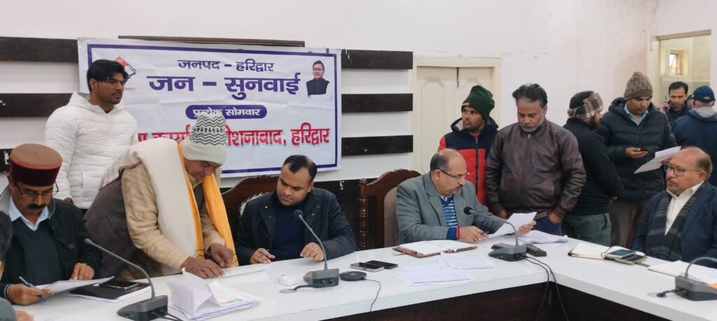 जनसुनवाई कार्यक्रम में शिकायतकर्ता केशवधाम अन्नेकी हेतमपुर के ग्रामवासियों ने केशवधाम अन्नेकी हेतमपुर में पेयजल की समस्या को लेकर प्रार्थना पत्र दिया गया।ललित राजपूत निवासी कनखल ने बस स्टैंड के निकासी गेट पर चाय का स्टॉल एवं फल की ठेली लगा कर अवैध कब्जा कर लिया है,उक्त जगह को कब्जा मुक्त कराने को लेकर प्रार्थना पत्र दिया।शिकायतकर्ता मोहल्ला तेलियान ज्वालापुर के निवासियों ने मोहल्ला तेलियान में सड़क के दोनों तरफ की नालियों पर क्षेत्रवासियों ने कब्जा कर रखा है,जिस कारण नाली का गंदा पानी सड़कों पर एवं घरों में घुस जाता है,नालों को अतिक्रमण मुक्त कराने को लेकर प्रार्थना पत्र दिया गया। प्रार्थी जुल्फिकर अहमद निवासी पिरान कलियर ने अपनी पत्नी शहजाद बेगम खाता संख्या 516 खसरा नं 193 रखवाई 02 बीघा खाम मौजा इमलीखेड़ा धर्मपुर परगना रुड़की की भूमि मौके पर कम हो रही है, उक्त भूमि की पैमाईश पुलिस बल की मौजूदगी में कराए जाने को लेकर प्रार्थना पत्र दिया। मो.शहीद पुत्र मुस्लिम ने जन्म प्रमाण पत्र बनवाने को लेकर प्रार्थना दिया। शिकायतकर्ता डॉ हिमांशु द्विवेदी ने बीपीएल और अन्त्योदय से मिलने वाला निःशुल्क एवं सशुल्क चावल को ऊंचे दामों पर बेचने वाले के कार्ड निरस्त करने एवं घरेलू सिलेंडर का कमर्शियल इस्तेमाल रोकने के लिए प्रार्थना पत्र दिया। खेड़ाजर गांव के निवासियों ने गांव खेड़ाजर तहसील रुड़की जिला हरिद्वार के मंदिर सार्वजनिक रास्ते में कूड़ा कचरा एवं गायों का गोबर डाल कर कब्जा करने के संबंध में प्रार्थना पत्र दिया।शिकायतकर्ता नौशाद ने अन्त्योदय राशन कार्ड बनवाने को लेकर प्रार्थना पत्र दिया।जयपाल सिंह पुत्र आशा राम निवासी ग्राम ढाढेकी ने ग्राम ढाढेकी ढाणा मज़ाहिदपुर में हो रहे अवैध खनन को रुकवाने को लेकर प्रार्थना पत्र दिया। शिकायतकर्ता मायादेवी निवासी राजपुर की कृषि भूमि खसरा नं 653/3/2 स्थित ग्राम राजपुर मुस्तफाबाद में है,उक्त भूमि पैमाईश कराने के संबंध में प्रार्थना पत्र दिया।