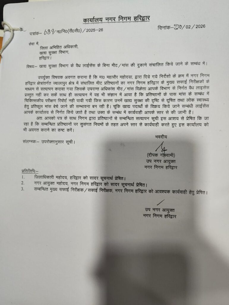 नगर निगम हरिद्वार ने अवैध मीट दुकानों की रिपोर्ट खाद्य सुरक्षा विभाग को सौंपी