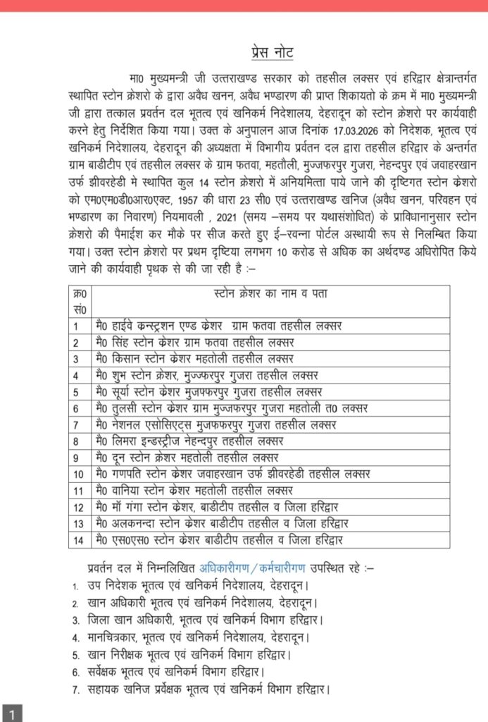 माननीय मुख्यमंत्री जी के निर्देश पर आज डीएम हरिद्वार के आदेश पर तहसील लक्सर एवं हरिद्वार तहसील के अंतर्गत स्टोन करें स्तोत्र द्वारा वेद खनन अवैध भंडार एवं प्राप्त शिकायतों के क्रम में आज तत्काल परिवर्तन भू एवं खनिकर्म निदेशालय देहरादून को स्टोन क्रशरों पर कार्रवाई करने हेतु निर्देशित किया गया आज दिनांक 17 3.2026 को निर्देशक भू एवं खनिकर विभाग देहरादून की अध्यक्षता में विभागीय परिवर्तन द्वारा तहसील हरिद्वार एवं लक्सर के ग्राम बड़ी टीम ग्राम फतवा महतोली मुजफ्फरपुर गुजर नैंदपुर एवं जीवरहेडी के 14 स्टोन क्रशरों पर कार्रवाई की गई दिन में भारी मात्रा में अनियमितताएं पाई गई स्टोन क्रशरों को एमएमडीआर एक्ट 1957 की धारा 23 सी उत्तराखंड खनिज अवैध खनन परिवन भंडारण का निवारण नियमावली 2021 के प्रावधानी अनुसार मौके पर पैमाइश कर सीज करते हुए ई रवणा पोर्टल अस्थाई रूप से निलंबित कर दिया गया है. और लगभग 10 करोड़ से अधिकतर तुरंत आरोपित किया गया है