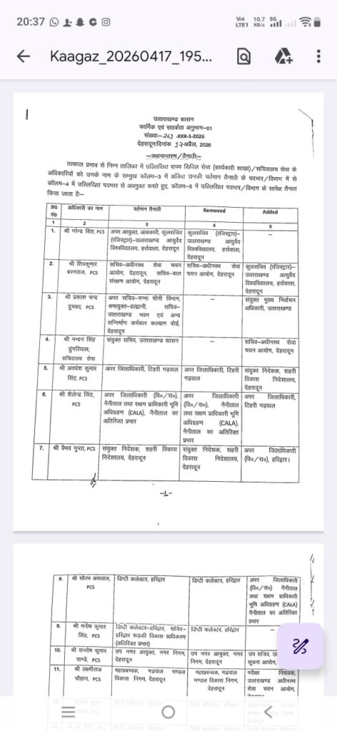 उत्तराखंड शासन द्वारा आईएएस पीसीएस अधिकारियों के किए गए ट्रांसफर April 17, 2026April 17, 2026Kuldeep Sharma हरिद्वार की सिटी मजिस्ट्रेट कुसुम चौहान जी का तबादला हुआ देहरादून बनी जीएमवीएन की md वैभव गुप्ता होंगे अपर जिला अधिकारी हरिद्वार