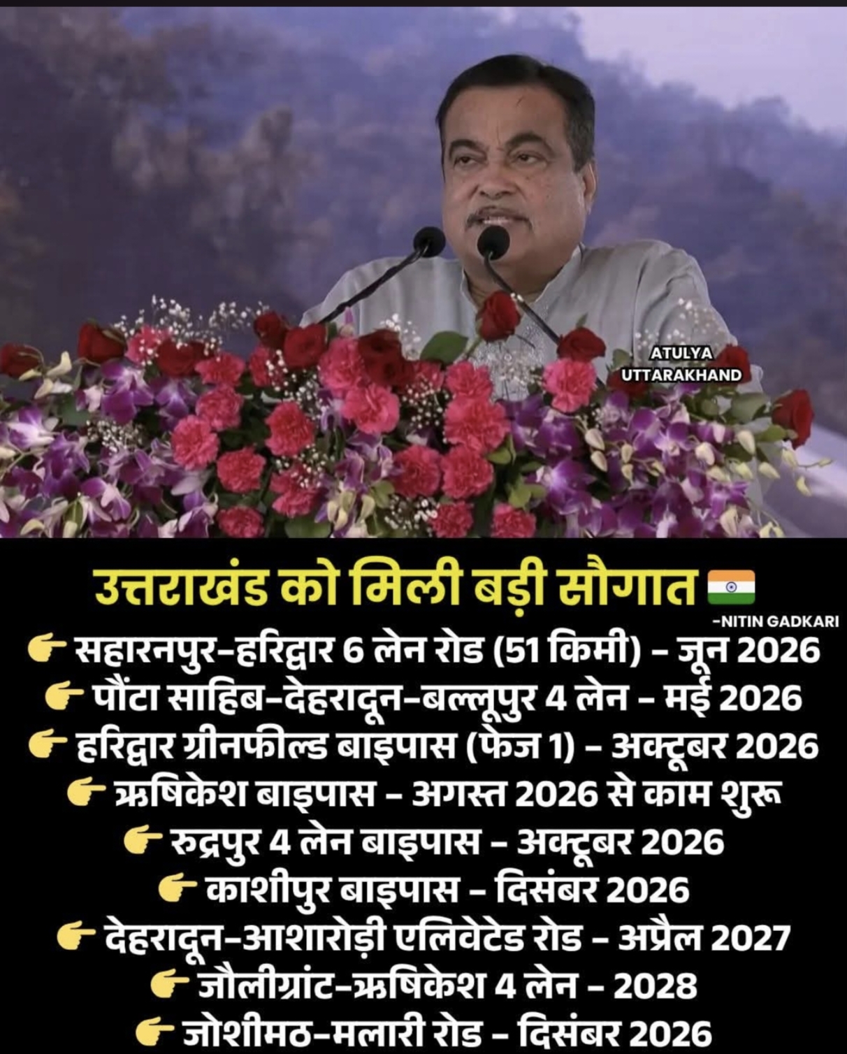 •सहारनपुर–हरिद्वार 6 लेन रोड (51 किमी) – जून 2026