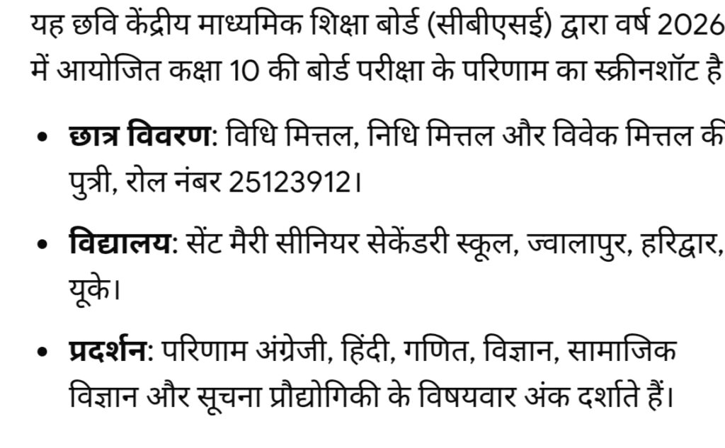 केंद्रीय माध्यमिक शिक्षा बोर्ड दसवीं की बोर्ड परीक्षा में सेंट मैरी सीनियर सेकेंडरी स्कूल ज्वालापुर की छात्रा विधि मित्तल के द्वारा 97.2 प्रतिशत नंबर लाकर स्कूल का और माता-पिता का नाम रोशन किया April 15, 2026April 15, 2026Kuldeep Sharma